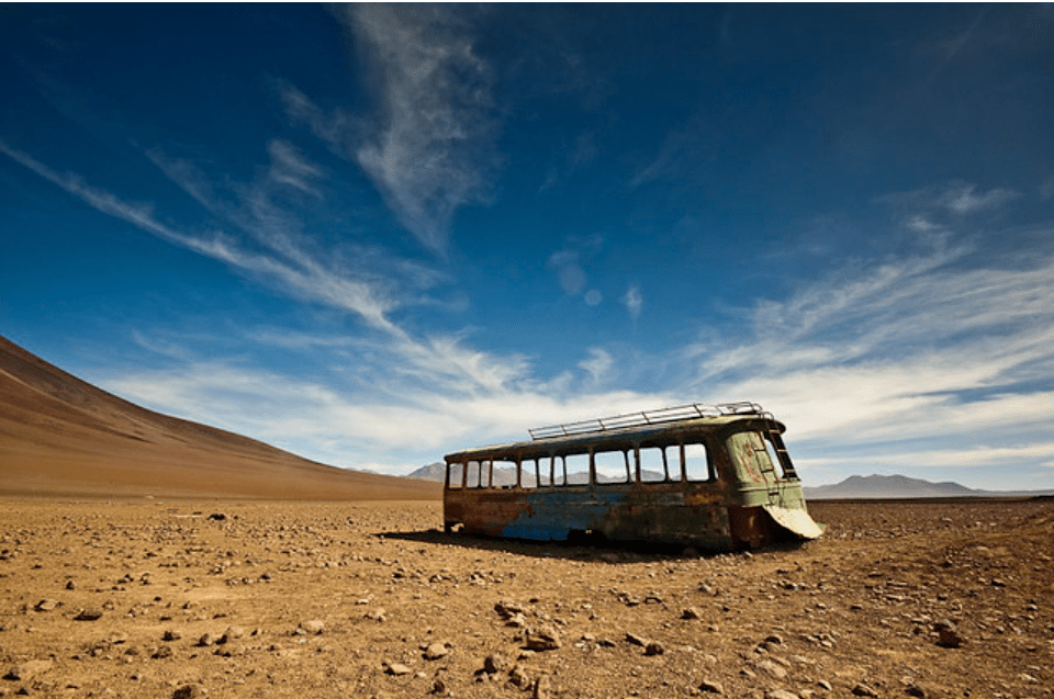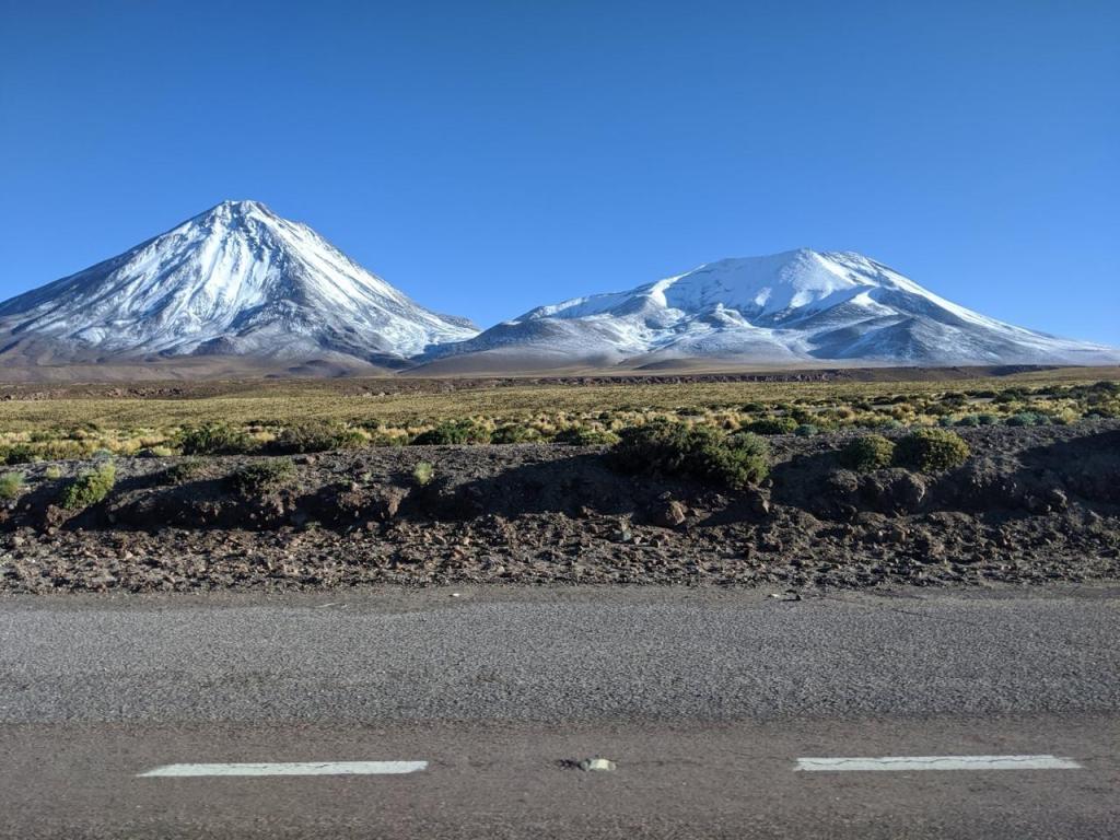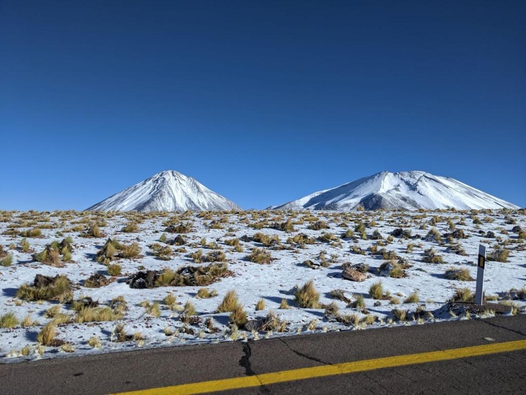 Mientras quienes me acompañan hacen la fila para cruzar la frontera, estoy sentado en una de las pocas piedras que están libres de nieve. ¡Cuanta locura! A unos cuantos kilómetros del desierto más seco del mundo, ayer por la noche, nevó. Y sino fuera por la nieve, haría mucho más sentido la palabra desierto, además de la casa que sirve de control fronterizo, y un bus abandonado a las faldas del volcán, y algunos otros dejando turistas y locales para que crucen a Bolivia, aquí en donde me encuentro, no hay nada más.